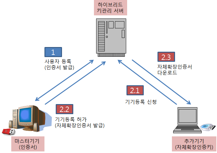 사용자 기기등록 과정은 신청->허가->완료의 3단계 과정을 거치게 되는데 외부에 의존하지 않고 키관리서버를 통신의 중개자로 이용하여 사용자 스스로 수행하는 작업입니다. 신청과 완료는 추가기기를 동작하여 수행하며 허가 단계는 마스터기기를 동작하여 수행합니다. 이 과정을 통하여 사용자는 자신이 소유하고 있는 추가기기에 자체확장인증서를 발급합니다. 자체확장인증서를 발급하면 추가기기에서 생성한 새로운 키는 자체확장인증키가 됩니다.